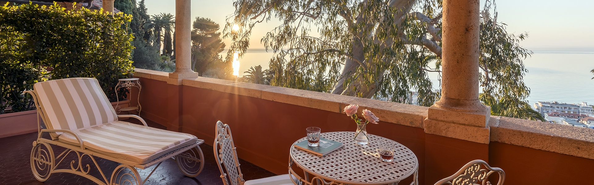 La stanza dedicata a Sir Walter Hamilton Dalrymple, il baronetto scozzese proprietario di Villa della Pergola dal 1900 al 1922, dispone di un grazioso terrazzo privato dal quale si ammira la più bella vista della baia di Alassio racchiusa tra Capo Santa Croce e Capo Mele.